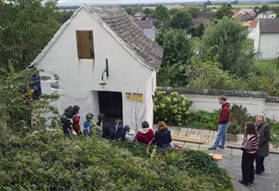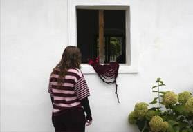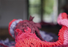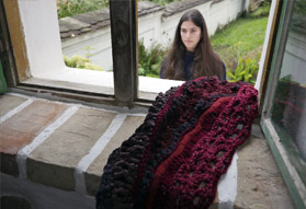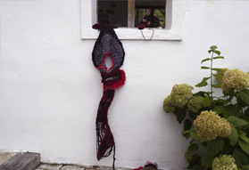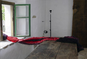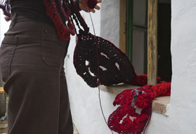 “MUME: Inside, Outwards and Back Within” is part of MUME’s annual program on memory and the right to be forgotten. The performance was conceived by Roberta Lazo Valenzuela (CL) and is presented in collaboration with Rosa Fuerpass-Netocny (AT). In her performance, Roberta Lazo crochets woolen threads reminiscent of organs while vocalizing songs of solace and belonging to mothers. In doing so, she unsettles the romanticized narrative of pregnancy and reveals the body as a vessel of both individual and collective memory.This body, oriented toward the functionality of nurturing a new other, later faces the grief of emptiness after having been occupied. Drawing from her personal experience, Lazo asks: How does this experience transform the relationship with one’s own body and identity? How does one reconnect with external normality and the surrounding world afterward? What memories are preserved, and what forgettings are set into motion? Inevitably, her proposal also alludes to the artist-as-vessel who, by hosting and nourishing, becomes filled and emptied, constantly deconstructing and reinventing. October 3, 2025, Kunstraum (former mortuary), Pfarrgarten, 3465 Koenigsbrunn am Wagram, Lower Austria. Photo: Manuela Picallo Gil.