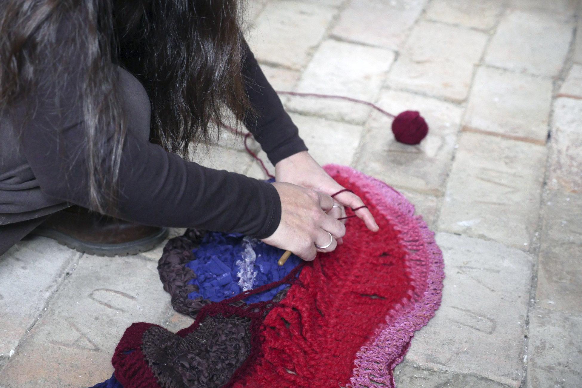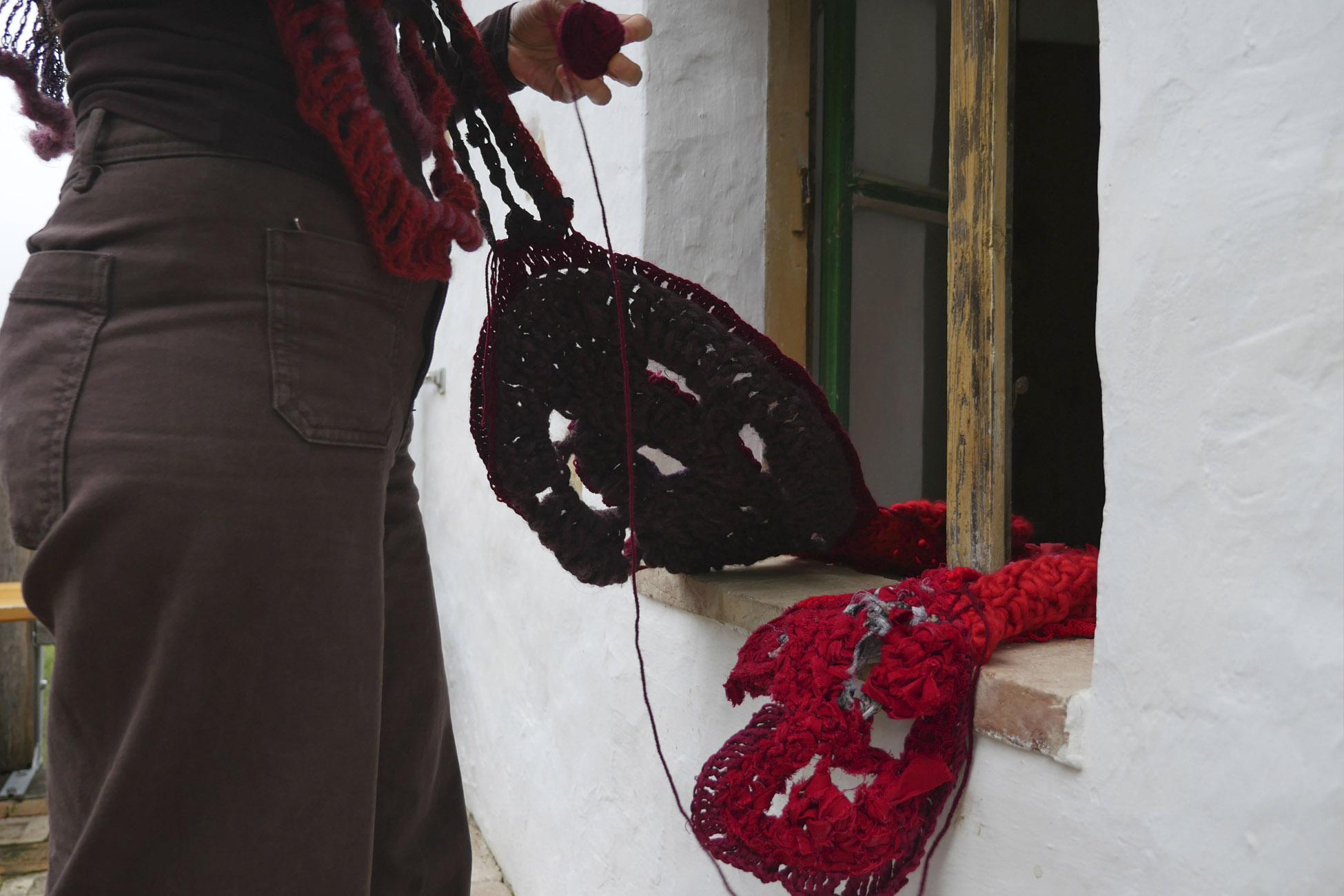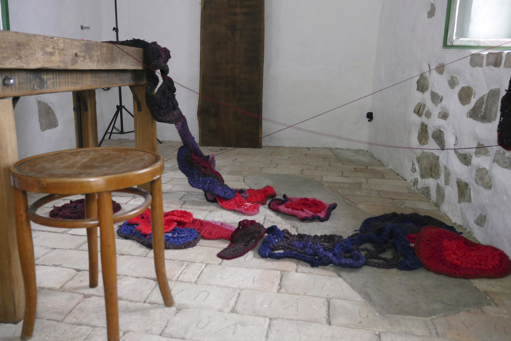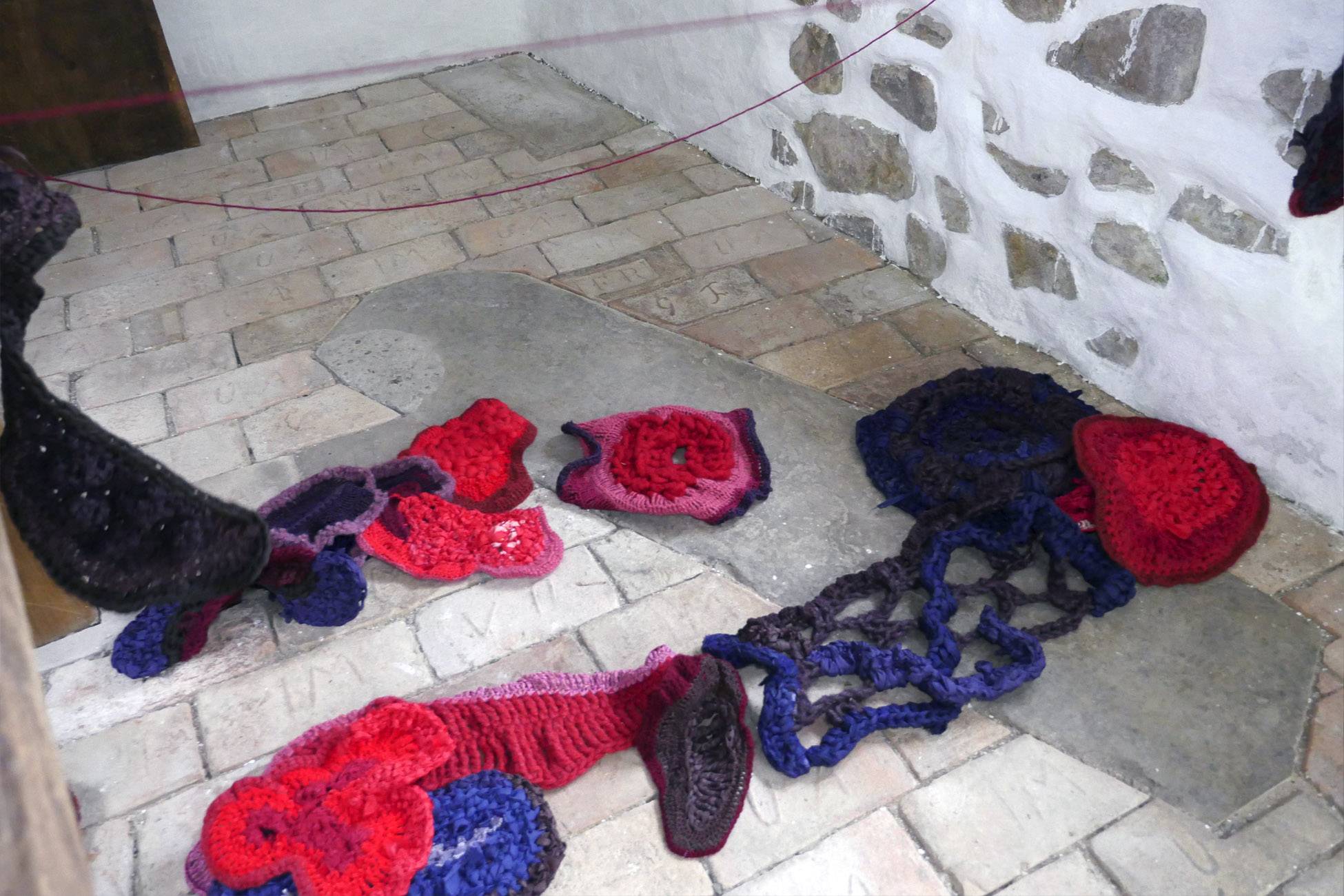 “MUME: Inside, Outwards and Back Within” is part of MUME’s annual program on memory and the right to be forgotten. The performance was conceived by Roberta Lazo Valenzuela (CL) and is presented in collaboration with Rosa Fuerpass-Netocny (AT). In her performance, Roberta Lazo crochets woolen threads reminiscent of organs while vocalizing songs of solace and belonging to mothers. In doing so, she unsettles the romanticized narrative of pregnancy and reveals the body as a vessel of both individual and collective memory.This body, oriented toward the functionality of nurturing a new other, later faces the grief of emptiness after having been occupied. Drawing from her personal experience, Lazo asks: How does this experience transform the relationship with one’s own body and identity? How does one reconnect with external normality and the surrounding world afterward? What memories are preserved, and what forgettings are set into motion? Inevitably, her proposal also alludes to the artist-as-vessel who, by hosting and nourishing, becomes filled and emptied, constantly deconstructing and reinventing. October 3, 2025, Kunstraum (former mortuary), Pfarrgarten, 3465 Koenigsbrunn am Wagram, Lower Austria. Photo: Manuela Picallo Gil.