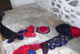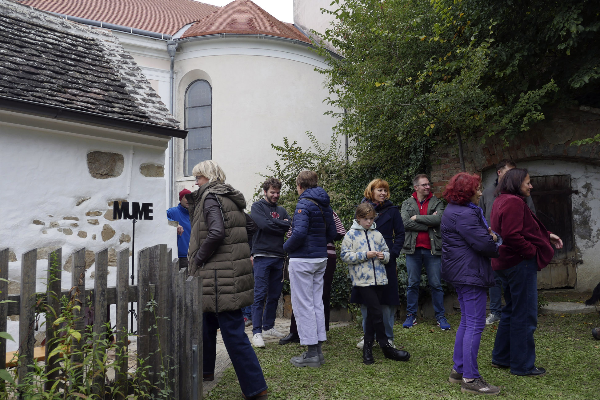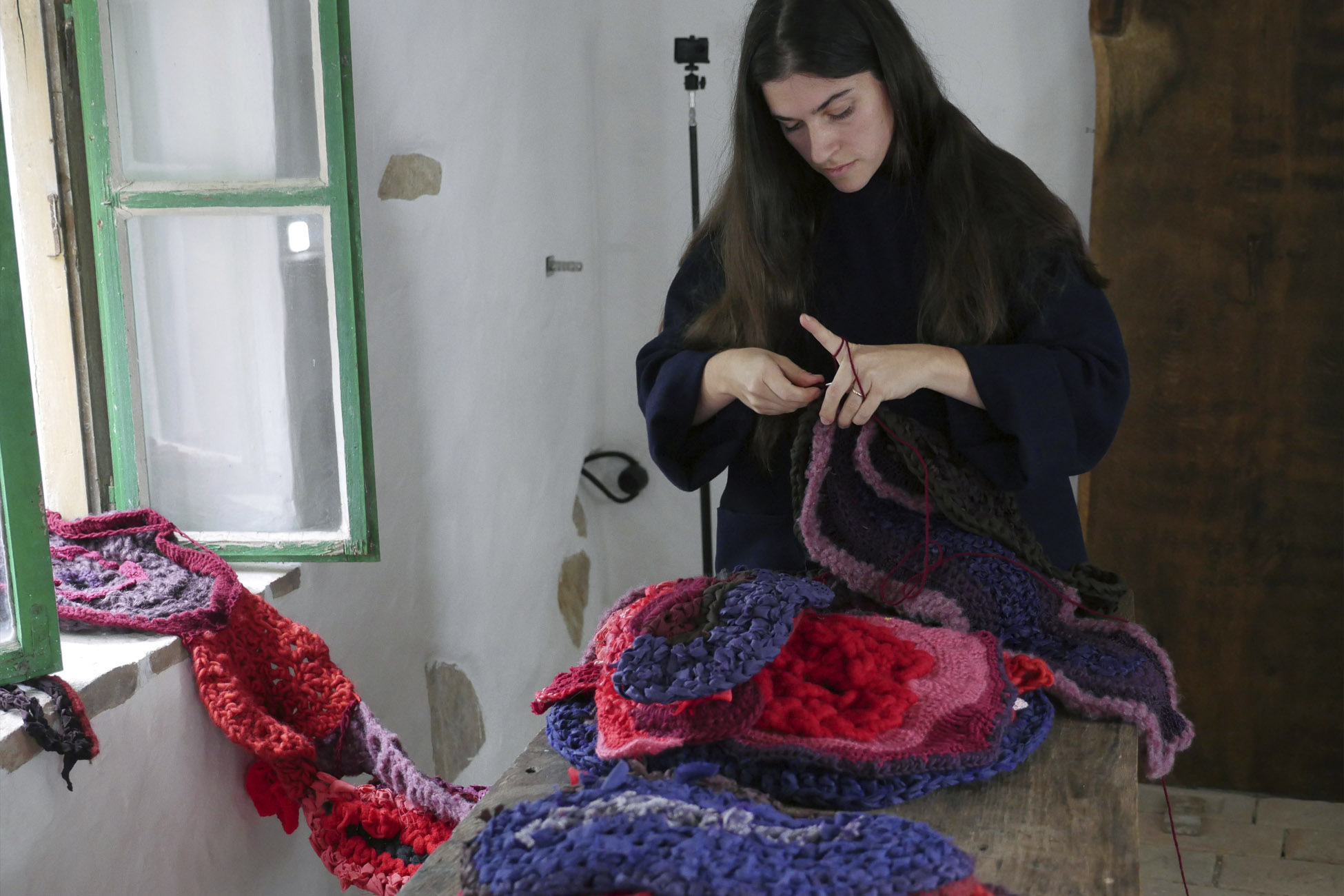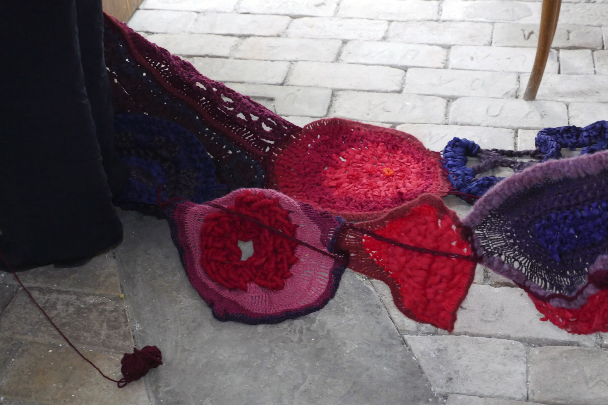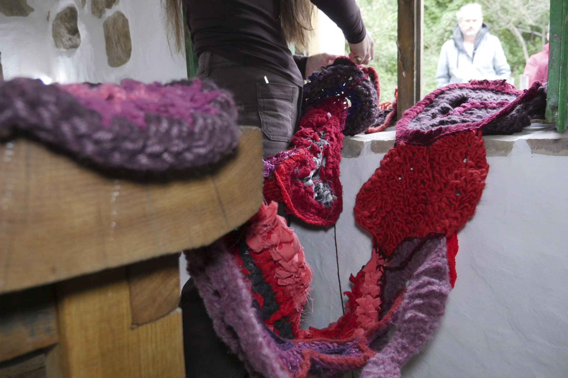 “MUME: Inside, Outwards and Back Within” is part of MUME’s annual program on memory and the right to be forgotten. The performance was conceived by Roberta Lazo Valenzuela (CL) and is presented in collaboration with Rosa Fuerpass-Netocny (AT). In her performance, Roberta Lazo crochets woolen threads reminiscent of organs while vocalizing songs of solace and belonging to mothers. In doing so, she unsettles the romanticized narrative of pregnancy and reveals the body as a vessel of both individual and collective memory.This body, oriented toward the functionality of nurturing a new other, later faces the grief of emptiness after having been occupied. Drawing from her personal experience, Lazo asks: How does this experience transform the relationship with one’s own body and identity? How does one reconnect with external normality and the surrounding world afterward? What memories are preserved, and what forgettings are set into motion? Inevitably, her proposal also alludes to the artist-as-vessel who, by hosting and nourishing, becomes filled and emptied, constantly deconstructing and reinventing. October 3, 2025, Kunstraum (former mortuary), Pfarrgarten, 3465 Koenigsbrunn am Wagram, Lower Austria. Photo: Manuela Picallo Gil.