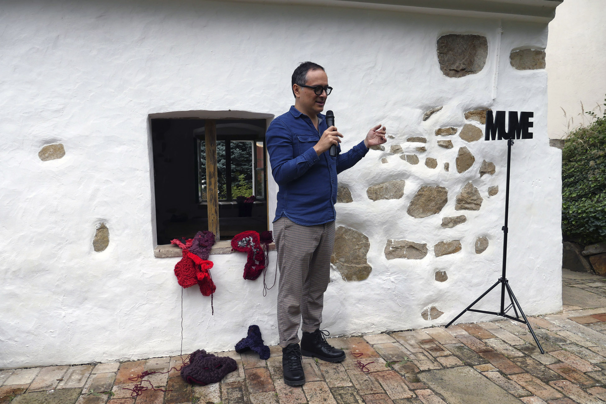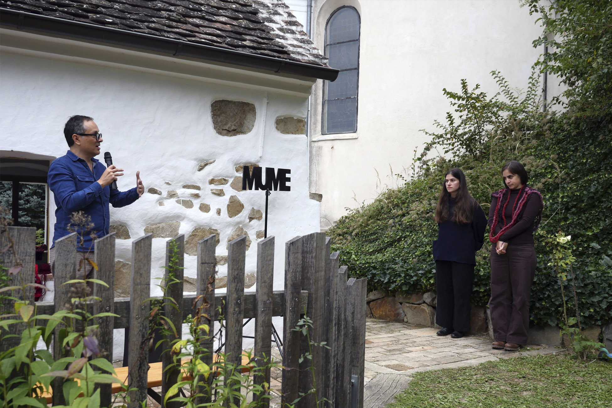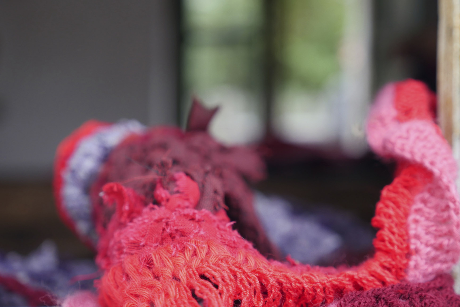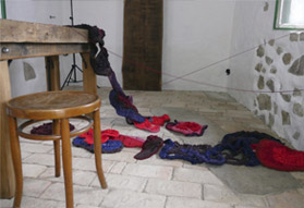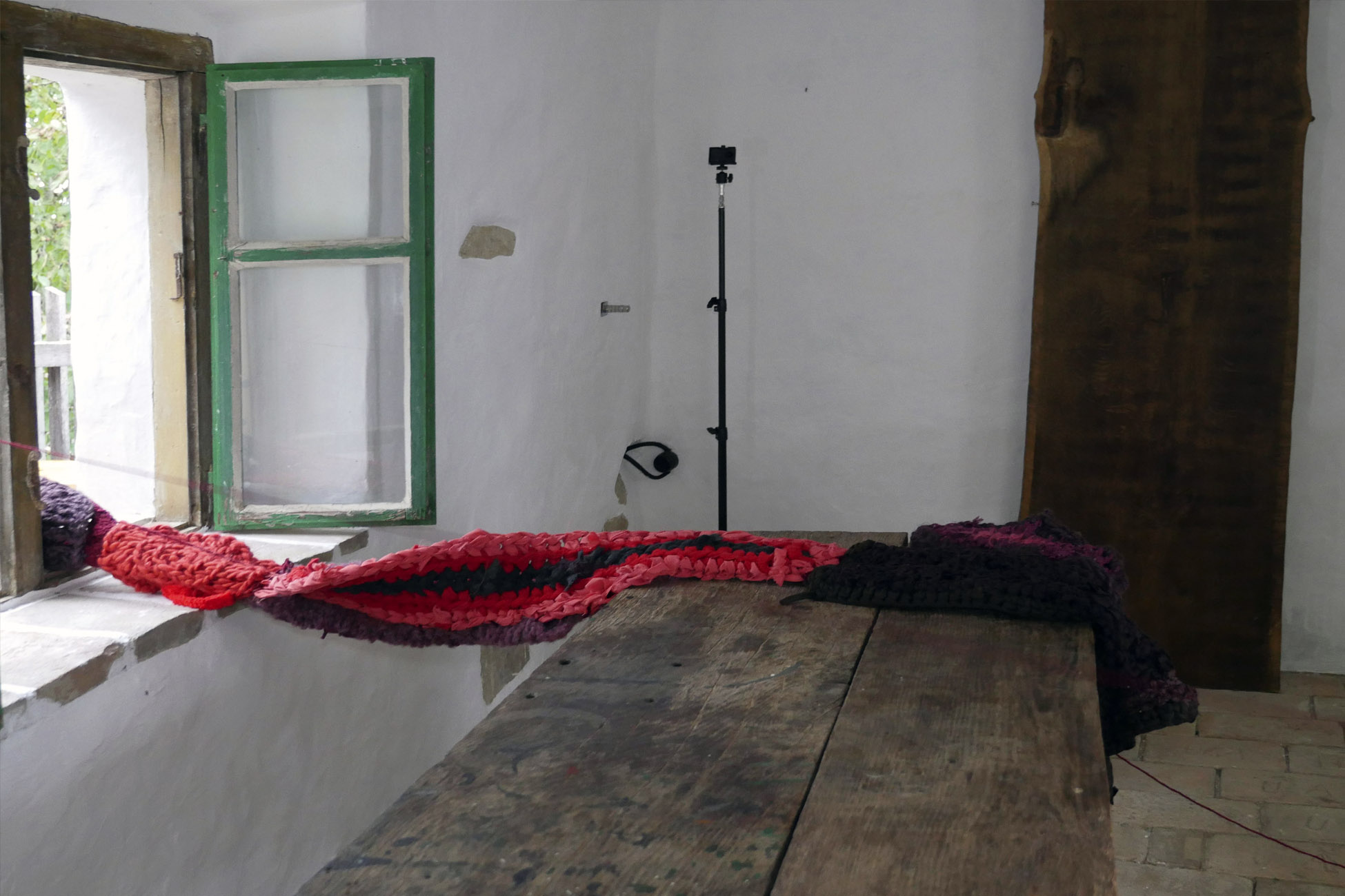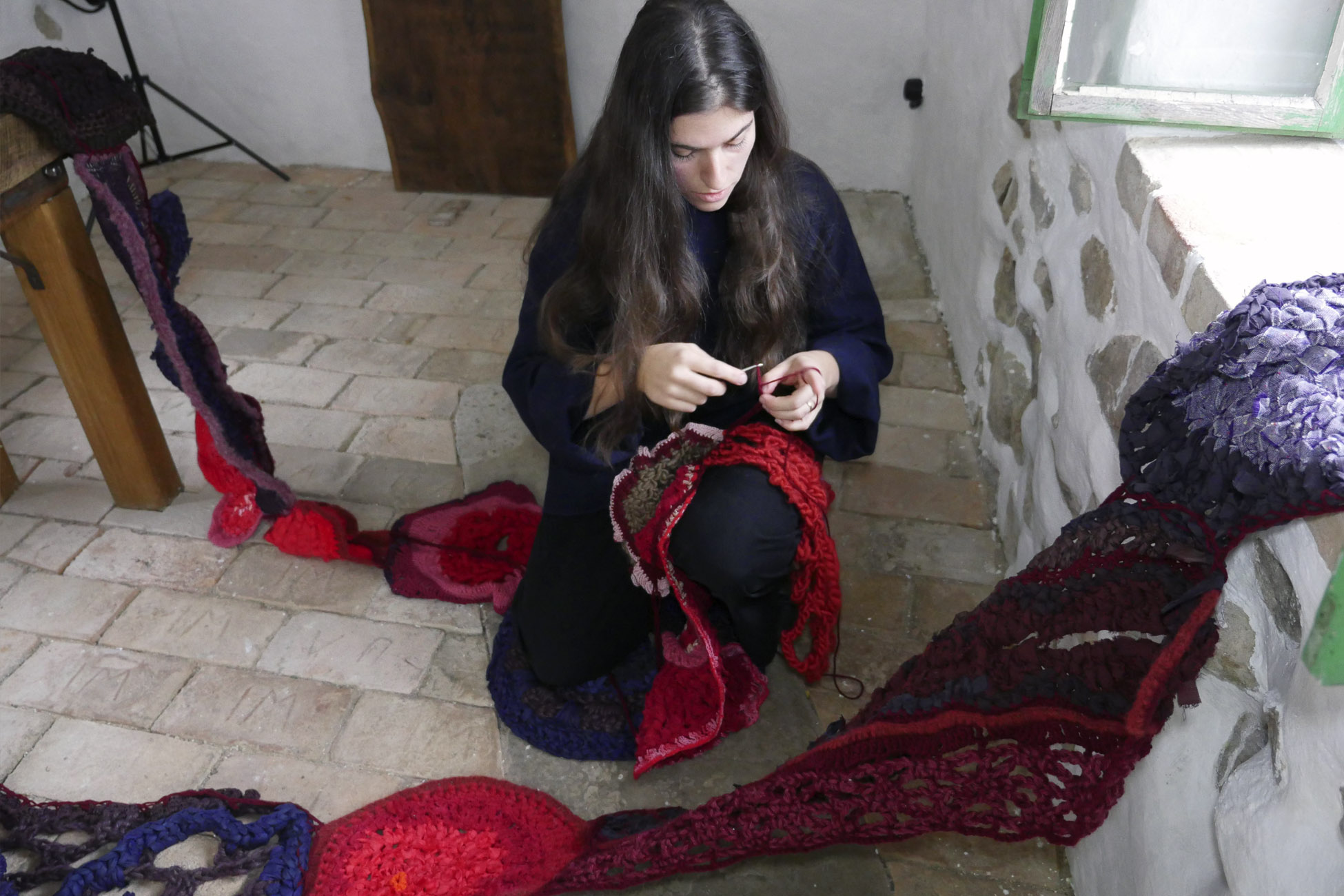 “MUME: Inside, Outwards and Back Within” is part of MUME’s annual program on memory and the right to be forgotten. The performance was conceived by Roberta Lazo Valenzuela (CL) and is presented in collaboration with Rosa Fuerpass-Netocny (AT). In her performance, Roberta Lazo crochets woolen threads reminiscent of organs while vocalizing songs of solace and belonging to mothers. In doing so, she unsettles the romanticized narrative of pregnancy and reveals the body as a vessel of both individual and collective memory.This body, oriented toward the functionality of nurturing a new other, later faces the grief of emptiness after having been occupied. Drawing from her personal experience, Lazo asks: How does this experience transform the relationship with one’s own body and identity? How does one reconnect with external normality and the surrounding world afterward? What memories are preserved, and what forgettings are set into motion? Inevitably, her proposal also alludes to the artist-as-vessel who, by hosting and nourishing, becomes filled and emptied, constantly deconstructing and reinventing. October 3, 2025, Kunstraum (former mortuary), Pfarrgarten, 3465 Koenigsbrunn am Wagram, Lower Austria. Photo: Manuela Picallo Gil.