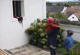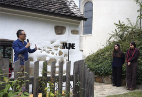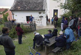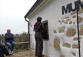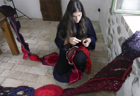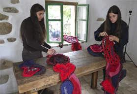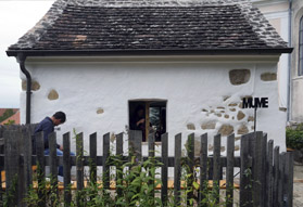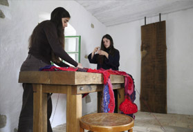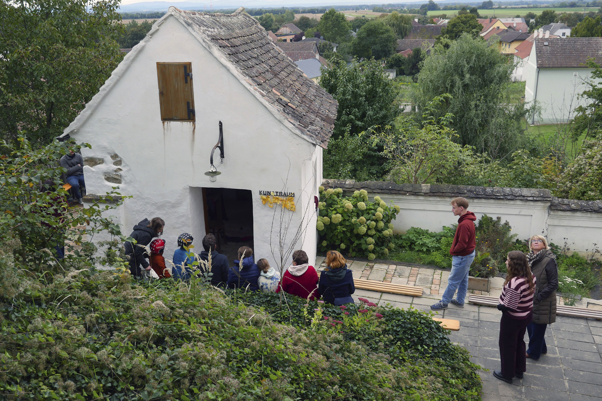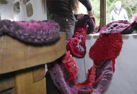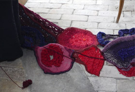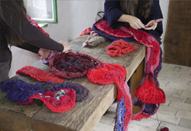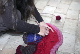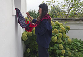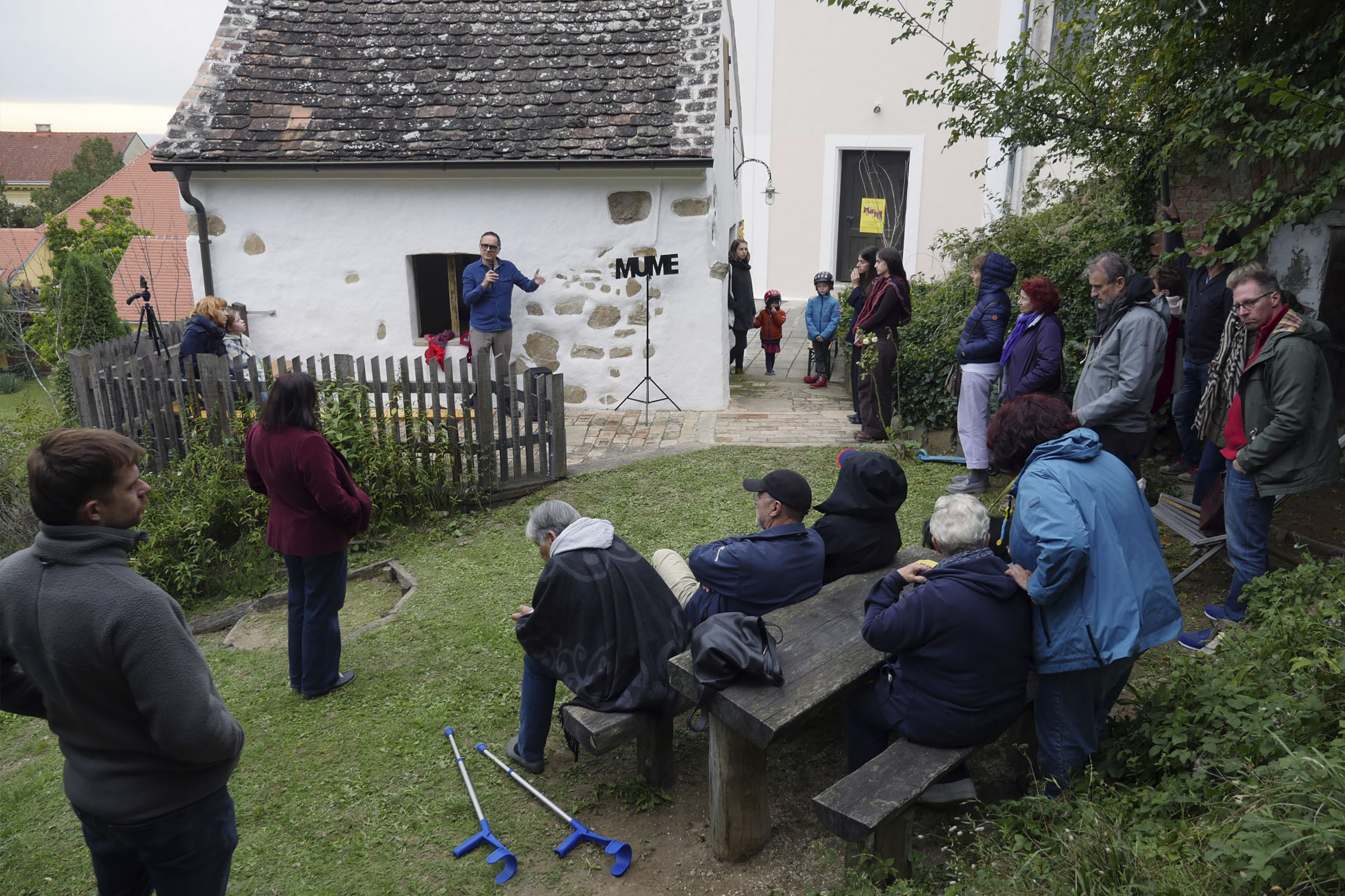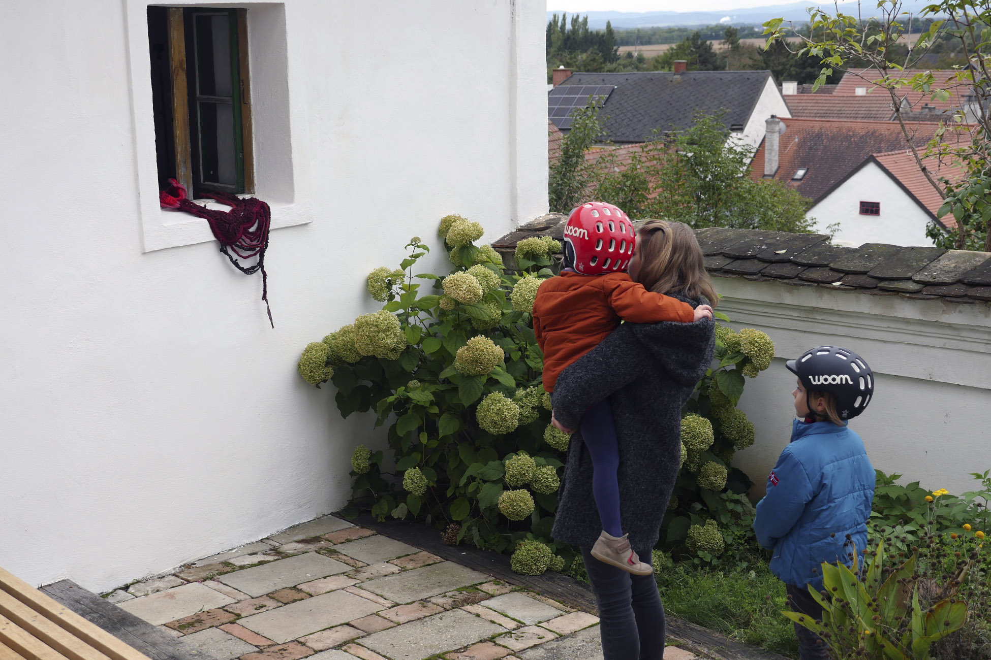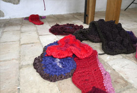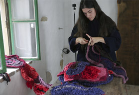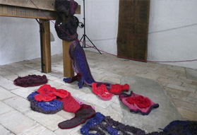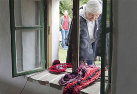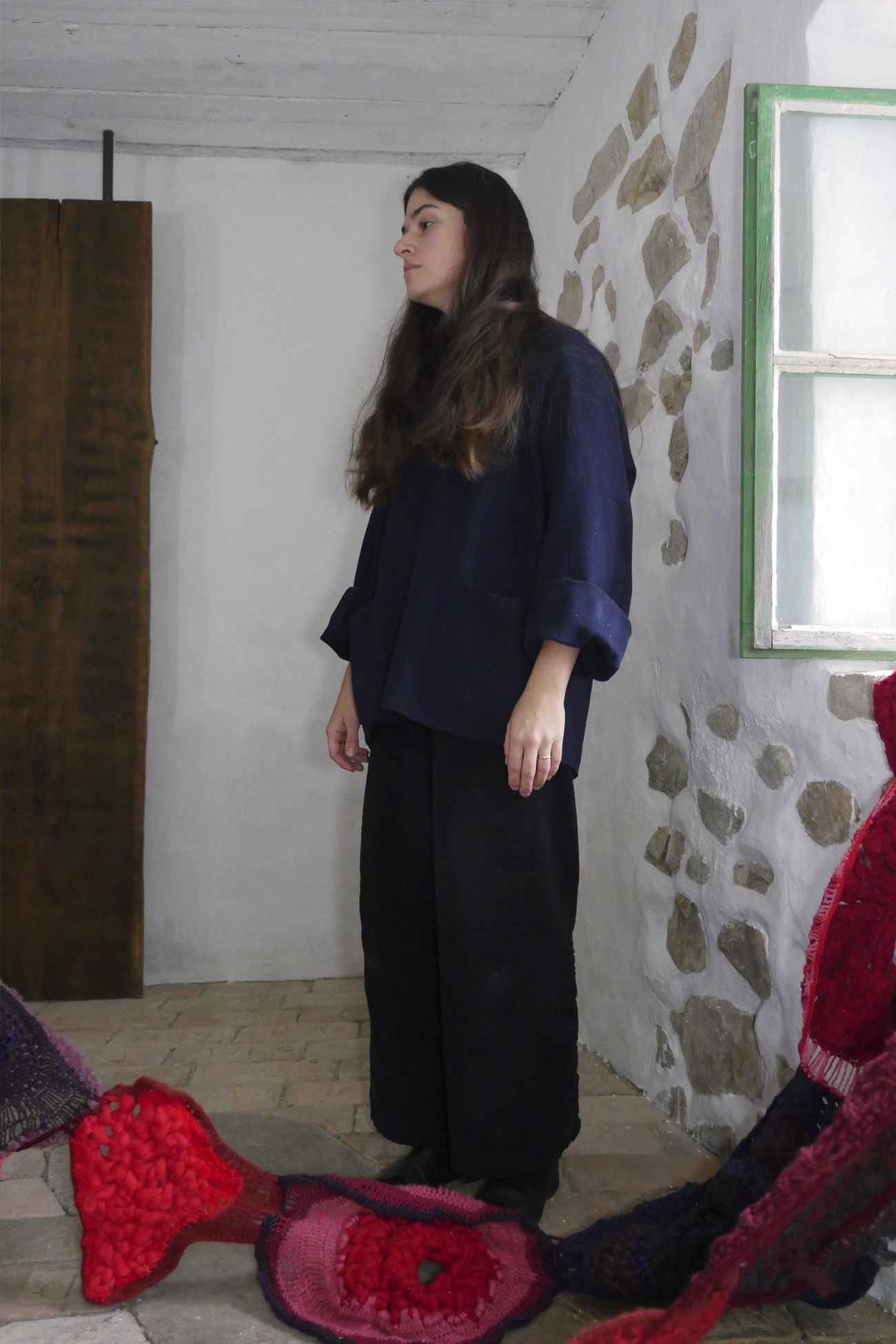 “MUME: Inside, Outwards and Back Within” is part of MUME’s annual program on memory and the right to be forgotten. The performance was conceived by Roberta Lazo Valenzuela (CL) and is presented in collaboration with Rosa Fuerpass-Netocny (AT). In her performance, Roberta Lazo crochets woolen threads reminiscent of organs while vocalizing songs of solace and belonging to mothers. In doing so, she unsettles the romanticized narrative of pregnancy and reveals the body as a vessel of both individual and collective memory.This body, oriented toward the functionality of nurturing a new other, later faces the grief of emptiness after having been occupied. Drawing from her personal experience, Lazo asks: How does this experience transform the relationship with one’s own body and identity? How does one reconnect with external normality and the surrounding world afterward? What memories are preserved, and what forgettings are set into motion? Inevitably, her proposal also alludes to the artist-as-vessel who, by hosting and nourishing, becomes filled and emptied, constantly deconstructing and reinventing. October 3, 2025, Kunstraum (former mortuary), Pfarrgarten, 3465 Koenigsbrunn am Wagram, Lower Austria. Photo: Manuela Picallo Gil.