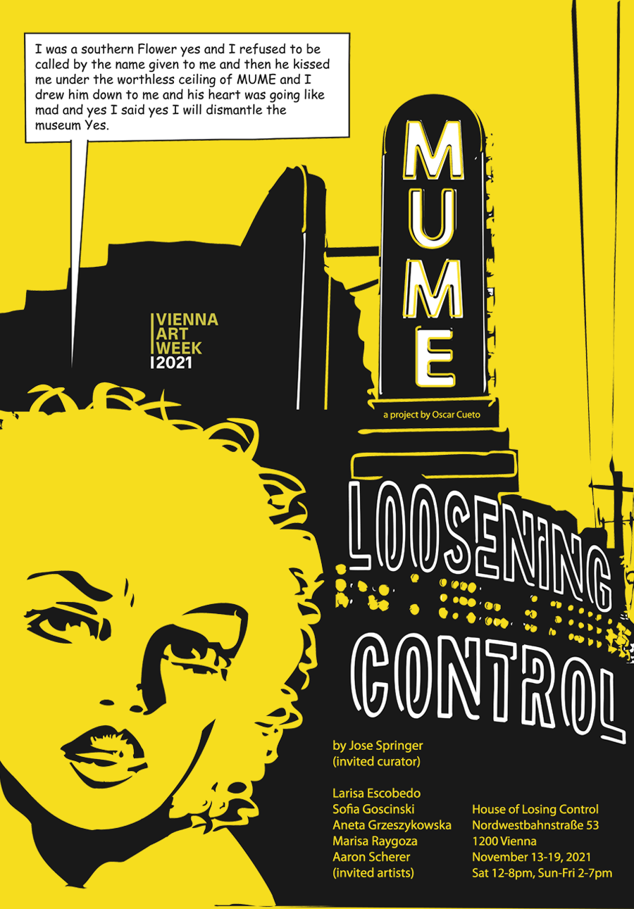 For this edition, MUME invited Jose Springer to curate the exhibtion "Loosening control", as part of the Vienna Art Week 2021 theme: House of Losing Control. This exhibition is dedicated to the women who worked in the club at Nordwestbahnstrasse 53. A site of pleasure, desire and explotation of sex-workers, whose lives have become a memory of Vienna. Five artists have been invited to establish connections through their works with the dreams of women living and working in the club's premises. Nordwestbanhstrasse 53, 1200 Vienna.