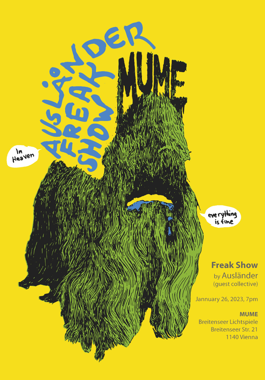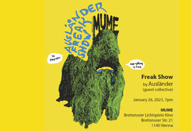 On this occasion, the Vienna-based artist and musical collective Auslaender presents “Freak Show” at one of the oldest active cinemas in the world, the Breitenseer Lichtspiele. With “Freak Show”, Auslaender (who take their name from the German derogatory term for "foreigners") reflect on the double standards of policies that take advantage of immigrants, integrating them into the labor force but excluding and limiting them politically, socially and culturally through key institutions that keep them categorized as "aliens". The project was originally proposed to be presented at the MA35 (Austrian Ministry of Immigration), but was rejected. The concert-performance is dedicated to Austrian visa applicants and those who support them. At the box office, everyone will receive a MUME/Auslaender-issued ID card that allows free entry and is valid for the day of the event. January 26, 2023 | Breitenseer Lichtspiele Kino | Breitenseer Str. 21, 1140 Vienna | 7pm. Free entrance. Customed freaks welcome!