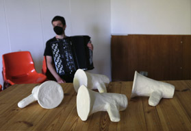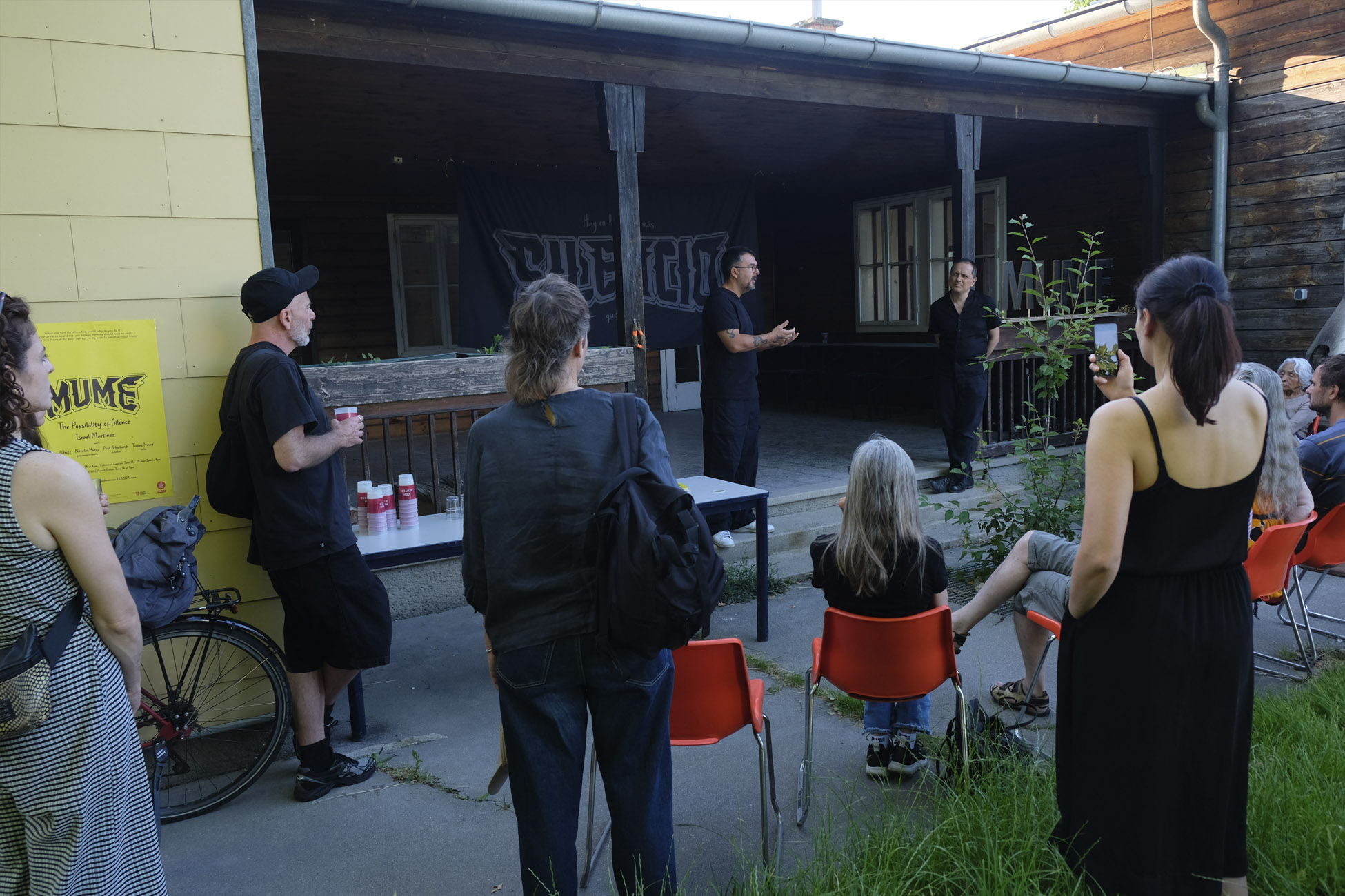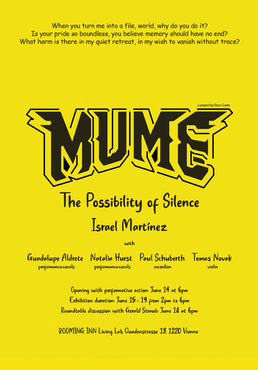 "The Possibility of Silence" is part of MUME's annual program on memory and the right to be forgotten. Conceived by Israel Martinez (MX), the project is presented in collaboration with Guadalupe Aldrete (MX/DE), Natalia Hurst (AR/DE), Paul Schuberth (AT) and Tomas Novak (CZ/AT). In the age of information, we seem to be building the most comprehensive archive in human history, where no one disappears without a trace. Beyond questions of transparency and access, we must also ask: how do we protect privacy and preserve silence, both personally and collectively? The Possibility of Silence reflects on silence not just as an individual right, but as a shared practice. During the opening, visitors are invited to mute their communication. A recording booth allows anonymous messages to be encoded and broadcast. Performers whisper secrets to individuals. Musicians play barely audible sounds and silent megaphones, purely sculptural, are scattered throughout the venue. Finally, within the exhibition's context, Gerald Straub (AT) hosts a Roundtable discussion to reflect on how we create our own noise in the urgency to be remembered, only to then question why there is no silence around us. June 14 - 19, 2025, ROOMING INN Living Lab, Quadenstrasse 13, 1220 Wien. Photos: Larissa Loza, Mario Ponton, Oscar Cueto.