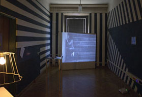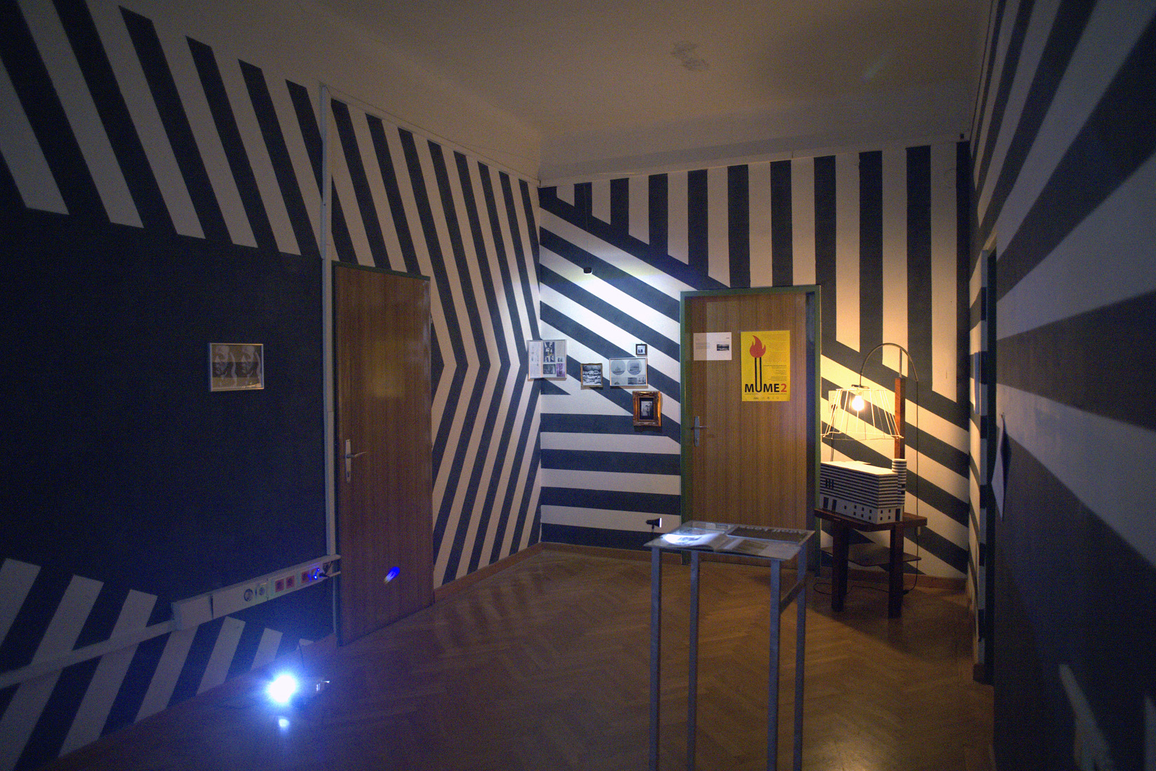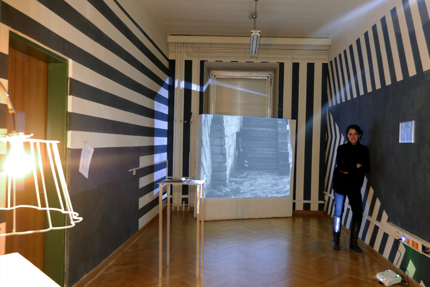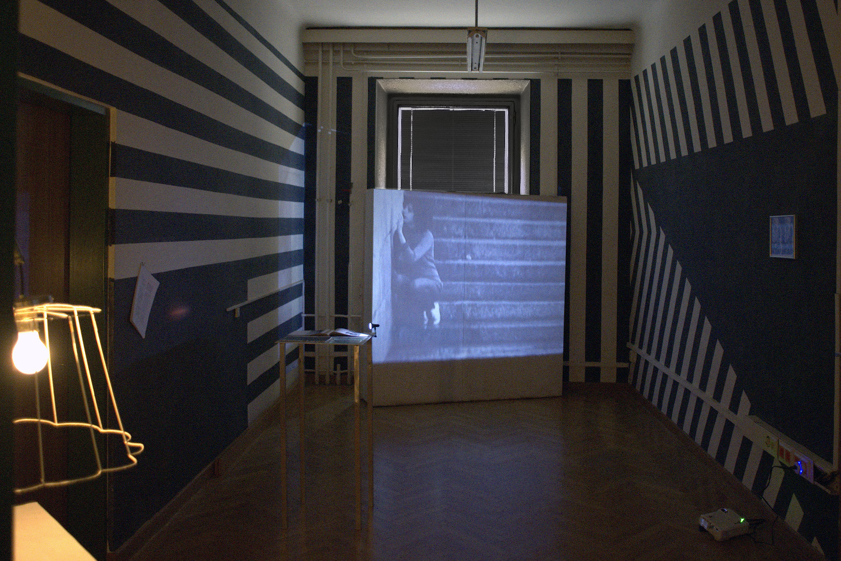 The second edition of 'MUME' took place in my former Studio and was hosted and supported by 'das weisse haus'. For this edition 'MUME' invited the mexican curator Andrea Torreblanca de la Sierra. Andrea Torreblanca was interested in anecdotes that relate to each other through minor associations and resemblances. This is a story of a possible fiction, one that connects different characters through small gestures, histories and pieces of evidence that fashion a relationship between museums, dance, politics and architecture. The Butterfly Effect: Notes for a Possible Fiction began as a personal quest to find the first female museum director in America, while Torreblanca was simultaneously being invited to realize an exhibition at MUME which was the perfect setting to replicate an itinerant "Bragg Box", ornamented as a Baker House with a "skin" that uses the pattern of dazzle warships to contain multiple stories. The museum-studio-box-house is thus set as a mise en abyme, where all facts or fictions can be seen, connected, forgotten or become invisible within an imagined place. The culmination or rather, the beginning of this story, is framed by the work of Yanieb Fabre, a Mexican artist based in Paris. Her video Neurotique New Erotique (2014) is set at the stairways of the Seine river in Paris. TEXT: SPA / ENG / GER |