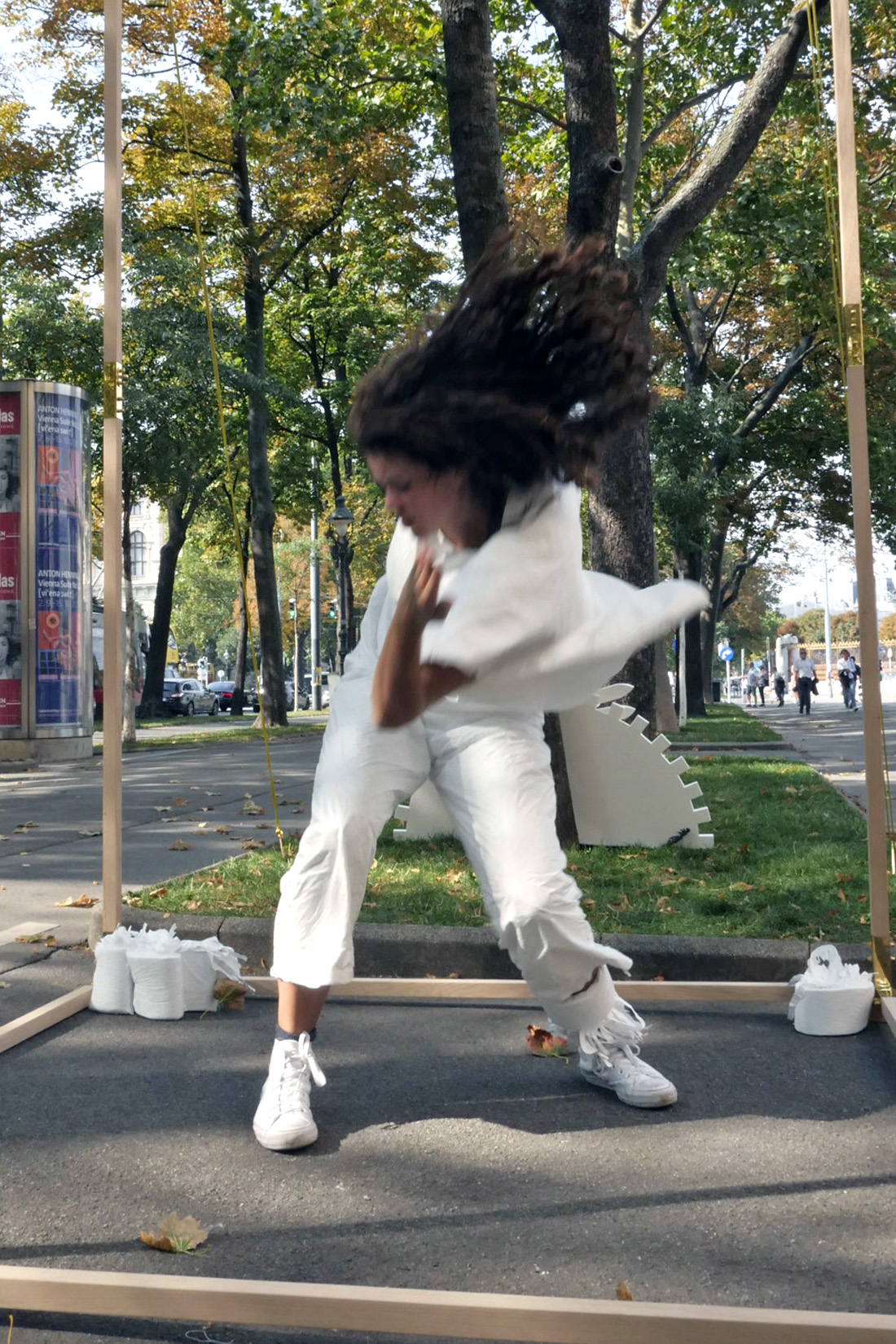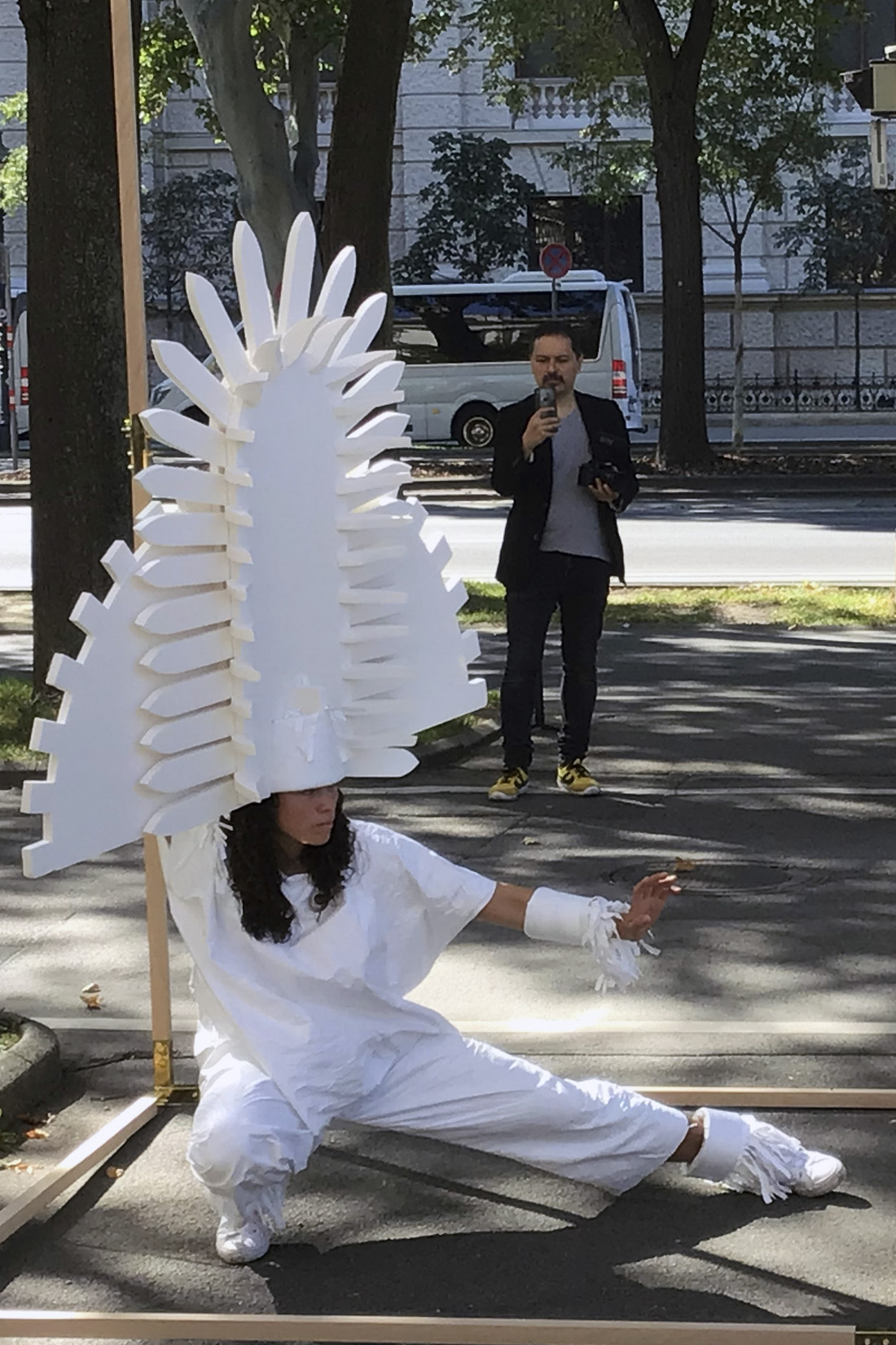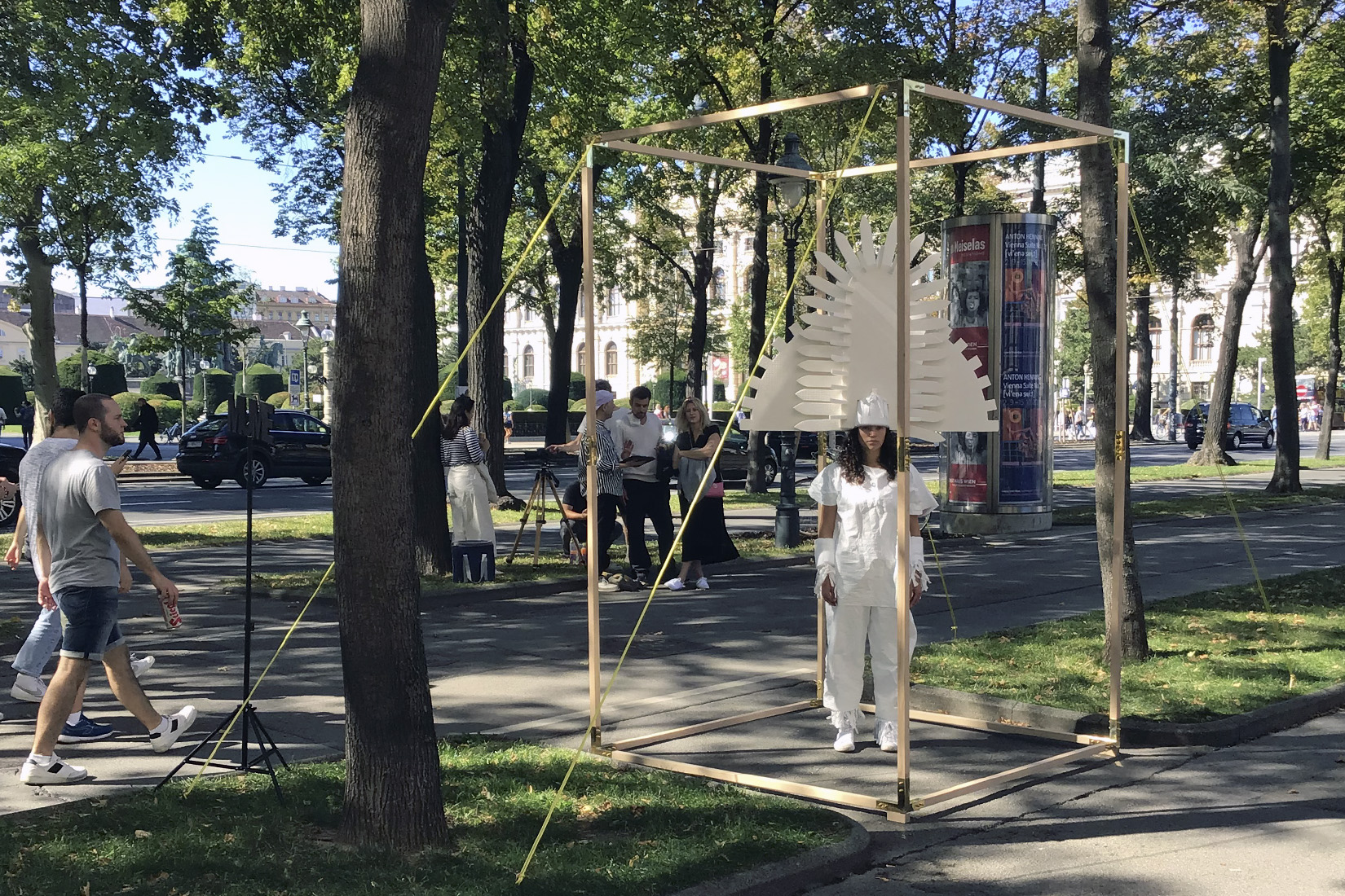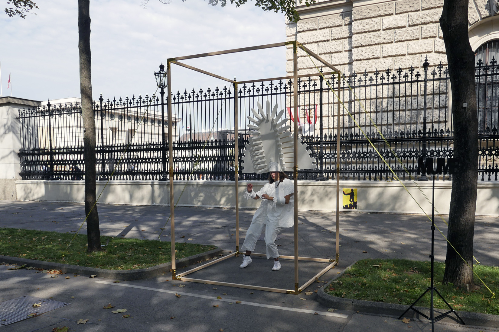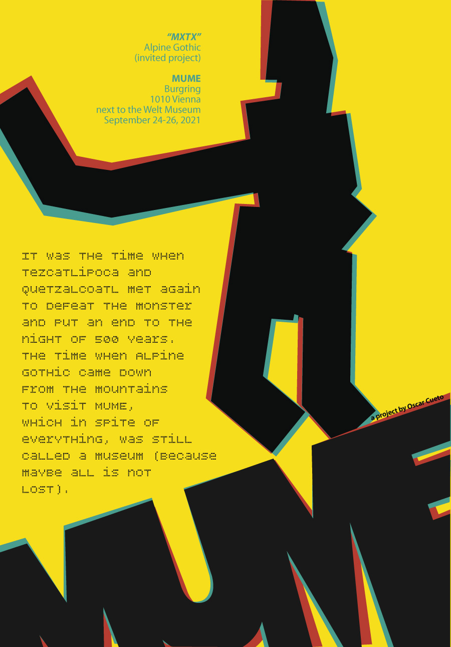 For the 9th Edition the art collective Alpine Gothic presented "MXTX" at MUME. MXTX is an interactive performance in public space that deals with encountering the unknown and overcoming fears.In a mobile, showcase-like structure that is positioned near the Weltmuseum, a performer in a hybrid costume that is reminiscent of Tyrolean Spiegeltuxer as well as Mexican feather crowns interprets "gestures of defense" that are made available to her by passers-by but also digitally and which she translates into possible movement patterns of ritualized interaction. MXTX is a performance by Alpine Gothic & Anna Barbara Bonatto.