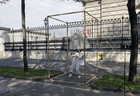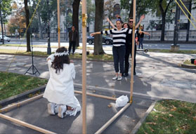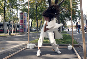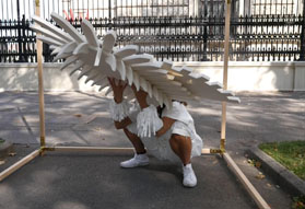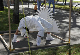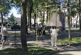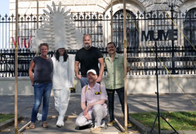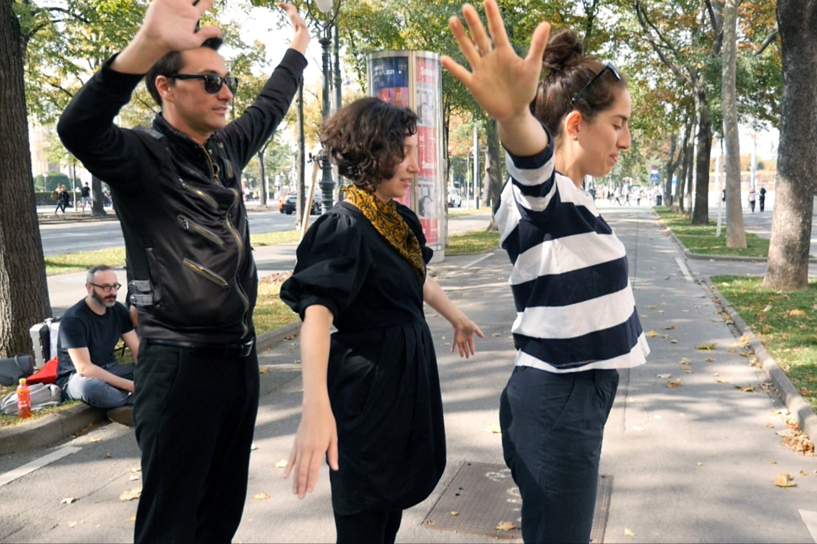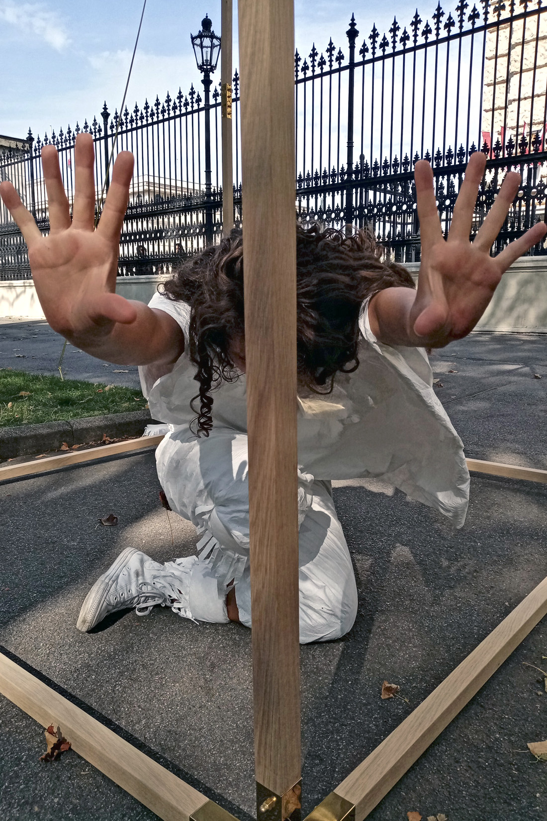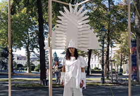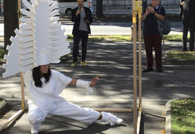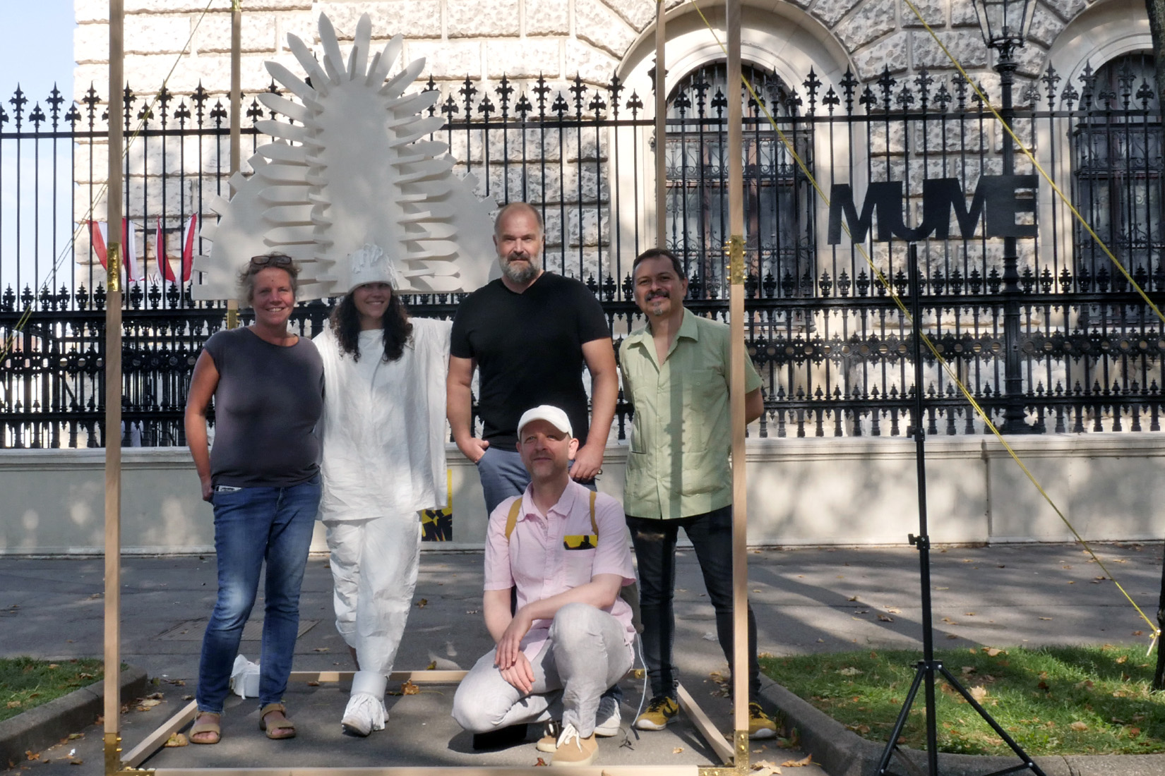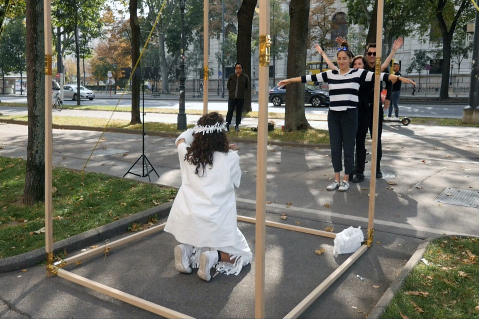 For the 9th Edition the art collective Alpine Gothic presented "MXTX" at MUME. MXTX is an interactive performance in public space that deals with encountering the unknown and overcoming fears.In a mobile, showcase-like structure that is positioned near the Weltmuseum, a performer in a hybrid costume that is reminiscent of Tyrolean Spiegeltuxer as well as Mexican feather crowns interprets "gestures of defense" that are made available to her by passers-by but also digitally and which she translates into possible movement patterns of ritualized interaction. MXTX is a performance by Alpine Gothic & Anna Barbara Bonatto.