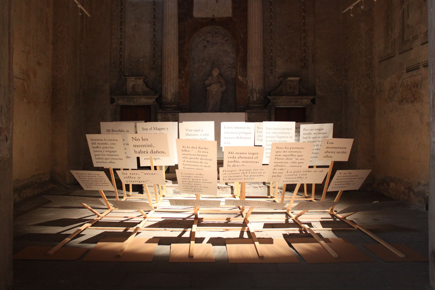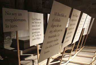"The Macedonian Phalanx" depicts the Macedonian Army Infantry Formation made famous by Alexander the Great arranged in its formal construction with billboards displaying political rhetoric replacing the original spears. In this version, Alejandro's fight uses the mind and its capacity to organize wordplay as the weapon rather than the force of the spears. This installation was showed at Museo X Teresa Arte Actual. TEXT: SPA / ENG / GER |
