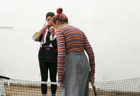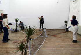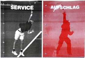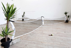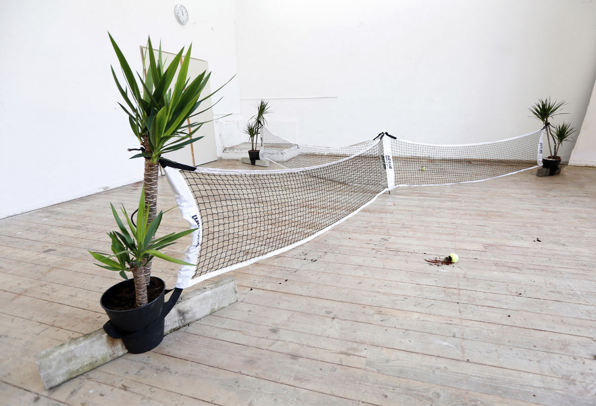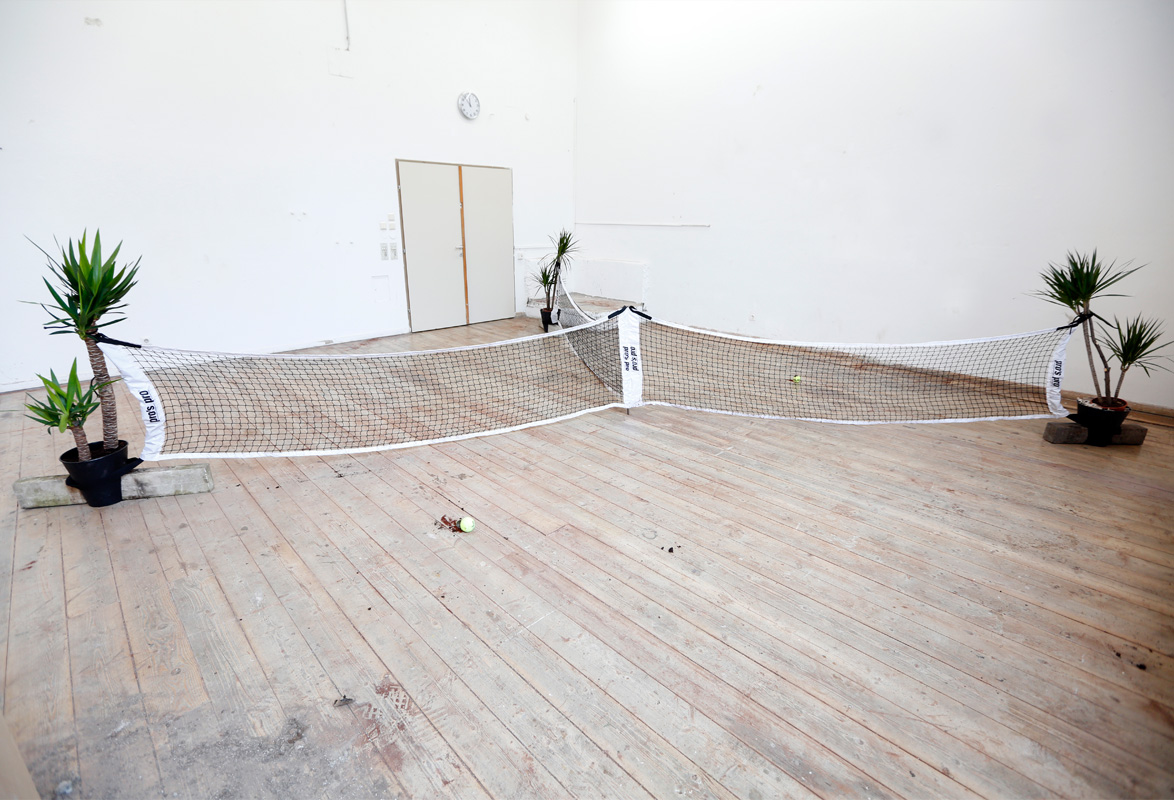"Service/Aufschlag" reinterprets the sport of tennis by comparing the movement of tennis players hitting a ball with the movement of protestors throwing a Molotov cocktail. While acknowledging the aristocratic origins of tennis, this comparison of movements aims to distance the racket sport from its upper-class context, by juxtaposing it with social extremism, to suggest that perhaps timing and position have become outmoded, displaced by labour that produces energy and energy which in turn produces a reaction. Or alternately, that the cost of bourgeois welfare is inversely proportional to the nonconformity of an exploited class.The object of the game is to play the ball in such a way that the opponent is not able to play a valid return or until the ball breaks and releases the cocoa. Three nets are stretched across the court, dividing it into three equal ends. The publication is a selection of pictures of players hitting a service and people throwing Molotov cocktails. This performative installation was showed in Oskar Kokoschka Square in Vienn and at 5020 gallery, SalzburgTEXT: SPA / ENG/ GER