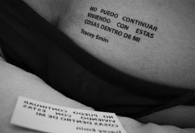 Temporary tattoos with a selection of phrases from artistic and philosophical celebrities of the Western world are given away in an art context (in this case the Museo de Arte Carrillo Gil in Mexico City) while a model shows the 'pret a porter' collection and encourages the public to wear them.